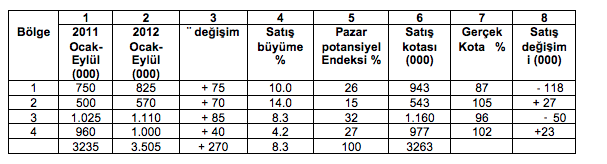 Anadolu Bilgisayar Şirketi tarafından kullanılan satış sonuçları Şekil 8.9’da verilmiştir. Rakamlar, yöneticinin bireysel satış elemanının performansını değerlendirebilmesi için bölgelere göre ayrımlanmıştır. Her bölgede bir satış elemanının çalıştığı varsayılmaktadır. Sütun 1 ve 2, 2011 ve 2012 yılları için yılbaşından bu yana satış rakamlarını göstermektedir. En yüksek satış rakamlarının 3. ve 4. bölgelerde olduğu, 3. bölgenin parasal değer bazında en yüksek artış yaşanan bölge olduğu görülmektedir. Bu değişimler yüzdeye çevrildiğinde 2. bölgenin en iyi artış yaşayan bölge olduğu görülecektir. Onu 1. bölge izlemektedir. Buraya kadar rakamlar 3. bölgedeki satış elemanının gelir anlamında, 2. bölgenin ise satış gelişimi anlamında en iyi olduklarını göstermektedir. Doğru cevap E'dir.