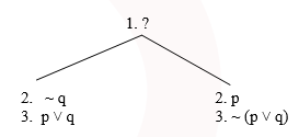 Yukarıdaki çözümleyici çizelge karşılıklı-koşullama önermesinin değillemesi olduğundan soru işareti yerine ~ (~ q ↔ (p ˅ q)) önermesi gelmelidir.