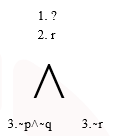 1. ve 2. satır alt alta olduğundan iki önerme arasında ˄ simgesi olmalıdır. Ayrıca 2. satırda r bulunduğundan 2. satırdan sonra gelen dallanma 1. satırdan kaynaklanan bir dallanmadır.3. satırdaki ̴ p˄ ̴ q ve ̴ r ifadelerini incelediğimizde doğru cevap ((p˅q)→ ̴ r)˄r olur.