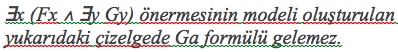 Modele baktığımızda GA'yı Gb şeklinde indirgeyebiliriz ve bu ifadenin doğruluk değeri D'dir. ∃x Gx ifadesini indirgedimizde ise Ga ∨ Gb ∨ Gc ifadesine ulaşırız. Modele göre Gb ve Gc ifadeleri doğru olduğu için Ga ∨ Gb ∨ Gc önermesinin doğruluk değeri de D olur. Bu durumda bu modele göre GA ↔ ∃x Gx önermesi doğru bir önerme olarak karşımıza çıkar. Doğru yanıt C seçeneğidir.