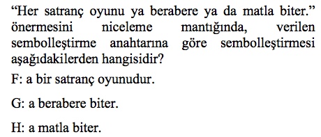 Nicelemeli önermelerin sembolleştirilmesinde temel adım, geleneksel mantıkta “kategorik önermeler” olarak adlandırılan dört temel nicelemeli önerme biçiminin sembolleştirilmesidir. Buna göre F ve G, “insan”, “canlı” gibi, herhangi iki genel terim olmak üzere, kategorik önermeleri genel olarak aşağıdakilerden hangisinde doğru olarak yer almaz?