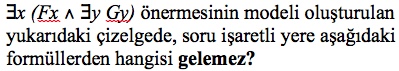 İlk niceleyiciyi kaldırarak indirgeme işlemi yaptığımızda ∃y (Fa ↔ Gy) ∧ ∃y (Fb ↔ Gy) ifadesi ortaya çıkar. Bu ifadeleri de indirgediğimzde bulduğumuz önerme ((Fa ↔ Ga) ∨ (Fa ↔ Gb)) ∧ ((Fb ↔ Ga) ∨ (Fb ↔ Gb)) önermesi olur. Doğru yanıt A seçeneğidir.