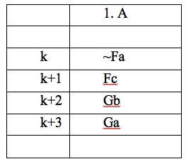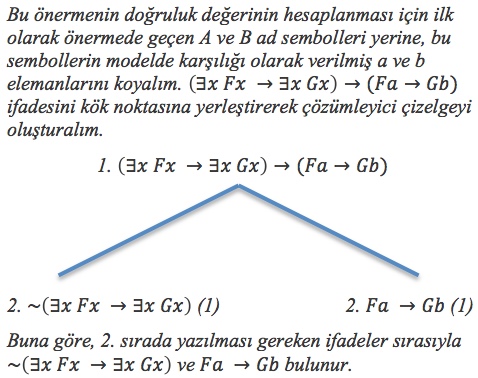 Önermenin değilinde ad sembolleri yerine birer eleman yazarak oluşturulan ifadeyi kök noktasına yazarak oluşturulan çizelgede tüm dallar kapanmalıdır. |