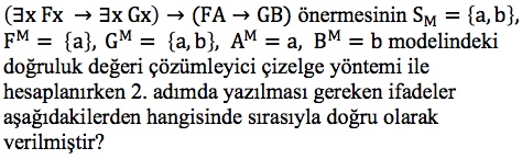 Bahsedilen eksik modelde ∀x ~Gx ifadesi GM kümesi boş küme olmadığından her yorumda yanlış olacaktır. Bu durumda, FA önermesi de yanlış olmalıdır ki, FA ↔ ∀x ~Gx önermesinin doğruluk değeri her durumda Y ↔ Y şeklinde doğru (D) olsun. Bize verilen eksik modelde A'yı yerine koyduğumuzda FA'yı Fb'ye indirgeriz. Bu durumda Fb'nin yanlış olması bize sorunun doğru cevabını verecektir. Bunu ifade eden önerme b ∉ FM önermesidir. Doğru yanıt E seçeneğidir.