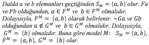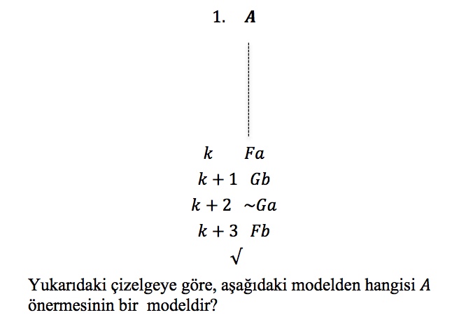 Aşağıdaki modellerin her biri ?x ((Fx ? GA) ? (Gx › Hx)) önermesini denetleyebileceğimiz birer modeldir: