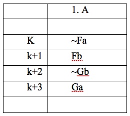 Önermenin değilinde ad sembolleri yerine birer eleman yazarak oluşturulan ifadeyi kök noktasına yazarak oluşturulan çizelgede en az bir açık dal olmalıdır. |