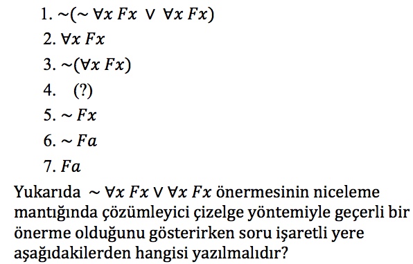 Çözümleyici çizelge ile nicelemeli bir sembolik önermenin geçerli olduğunu göstermek için yapılması gereken aşağıdakilerden hangisidir?