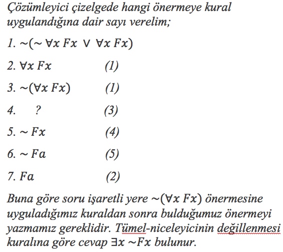 Önermenin değilinde ad sembolleri yerine birer eleman yazarak oluşturulan ifadeyi kök noktasına yazarak oluşturulan çizelgede tüm dallar kapanmalıdır.
