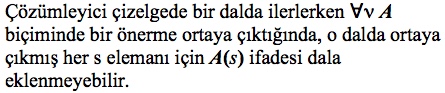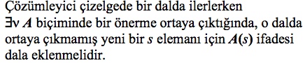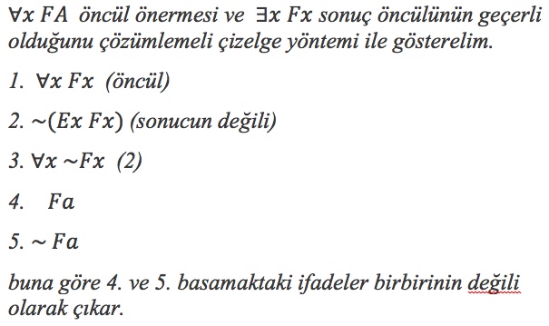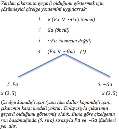 Kök noktasından başlayarak, öncüllerde ve sonucun değilinde ad sembolleri yerine birer eleman yazarak oluşturulan ifadeleri yazarak oluşturulan çizelgede tüm dallar kapanmalıdır. |