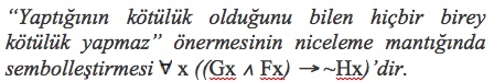 Yukarıdaki sembolleştirme anahtarına göre, “Yaptığının kötülük olduğunu bilen hiçbir birey kötülük yapmaz” önermesinin niceleme mantığında sembolleştirmesi aşağıdakilerden hangisidir?