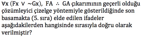 y (Fy → Ɐz (Gz ˄ Ga) önermesinin {a,b} kümesindeki doğrusal açılımı aşağıdakilerden hangisidir?