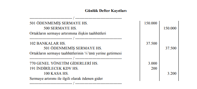 Bu işlemde 501 ÖDENMEMİŞ SERMAYE HS. alacak tarafına kaydedilirken 254 Taşıtlar hs., 252 binalar hs. ve 260 Haklar Hs. borç tarafına kaydedilir.