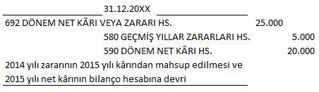 Şirket 2015 yılı sonunda ₺25.000 kâr elde etmiştir. 2014 yılındaki ₺5.000 zararın 2015 yılı kârından mahsup edilmesi kararlaştırılmıştır. Bu durumda yapılacak yevmiye kaydında aşağıdakilerden hangisi doğrudur?