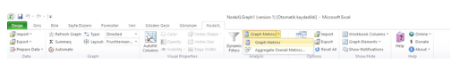 Graph Metrics’e tıklayarak bulunacak olan sonuçlar merkezilik ölçüleri ve diğer çizge ölçüleridir. Düğümlere ilişkin verileri elde etmek için farklı işlemler yapılmalıdır.