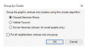 NodeXL programında çizge çizildikten sonra, “Groups” kısmından “Group by cluster” (kümelere göre grupla), kullanılacak algoritma seçimi ile uygulanır ve “Refresh Graph” (çizgeyi yenile)’e tıklanır. Elde edilen çizgeye ait verilerin bulunduğu çalışma sayfasında “Group Vertices” tıklandığında hangi düğümün hangi grupta yer aldığı görülebilir.