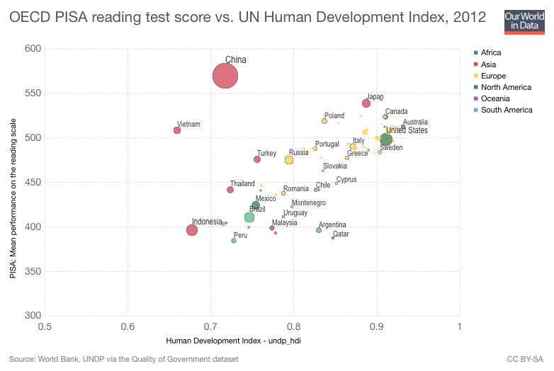 The following plot represents the relation between the PISA reading scores and the United Nations' Human Development Index (HDI) for a select group of countries.