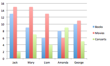 In the graphic above, the number of activities that five students did during a semester is present in a grouped bar chart. According to this data, which student attended the most concerts?