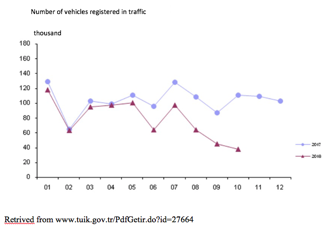 According to graphic, in 2018, during the second month of the year near 60 thousand vehicles, the fifth and seventh month of the year 100 thousand vehicles, and the tenth month of the year near 40 thousand vehicles are registered. However, during the first month near 120 thousand vehicles are registered. Thus, first month of the year is the month that the most vehicles are registered.