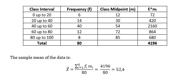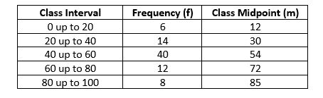 The frequency distribution table of the students’ performance scores of a school were constructed as follows. What is the sample mean of the data?