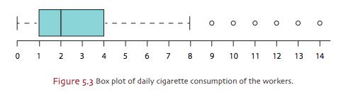 The median is 2 cigarettes. This means that 50% of the workers consume less than 2 cigarettes, and 50% of the workers consume more than 2 cigarettes. The 25th and 75th percentiles are 1 and 4 cigarettes, respectively. This means that 25% of the workers consume is either less than or equal to 1 cigarettes and 75% of the workers consume leither 4 or fewer than 4 cigarettes a day. The interquartile range is 4-1=3 cigarettes. This means that 50% of the workers consume 3 cigarettes. The highest and the lowest values within the upper and the lower boundaries for outliers are 8 and 0, respectively. There are outliers in the data. The values greater than 8 are the outliers. The shape of the distribution is right skewed, because the median line is closer to the 25th percentile and also the whisker over the 75th percentile is longer than the other whisker.The correct answer is C.