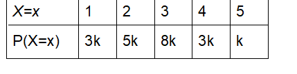 The sum of all probabilities must be equal to 1, if it is a probability distribution table. Thus 3k+5k+8k+3k+k=20k=1 then k=1/20=0.05