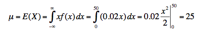 f (x) = 0.02, for 0 ? x ? 50. What is the mean of the continuous random variable X ?