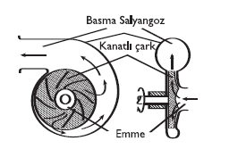 Santrifüj pompalarda salyangoz kabuğuna benzer disk şeklindeki bir gövde içerisinde yüksek hızda dönen bir fan bulunmaktadır. İlaç, fan merkezinden içeriye doğru emilerek santrifüj etkisiyle fan çevresine savrulur ve çıkış bölümlerine doğru yönlendirilir. Görselde bu özelliklere sahip santrifüj pompa görülmektedir.