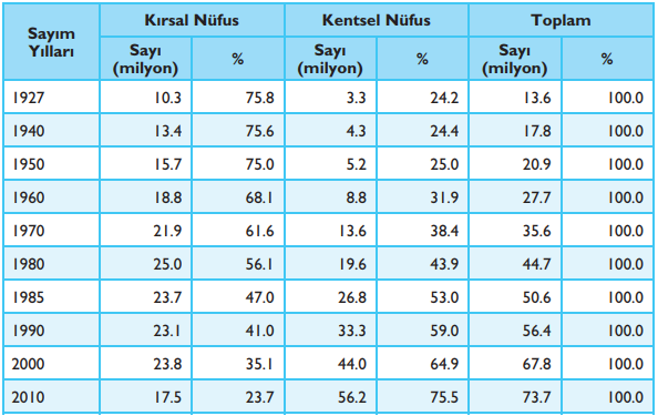 Aşağıdakilerden hangisi Türkiye’de kırsalda yaşayan nüfus miktarı hangi yılar arasında % 50’nin altına düşmüştür?