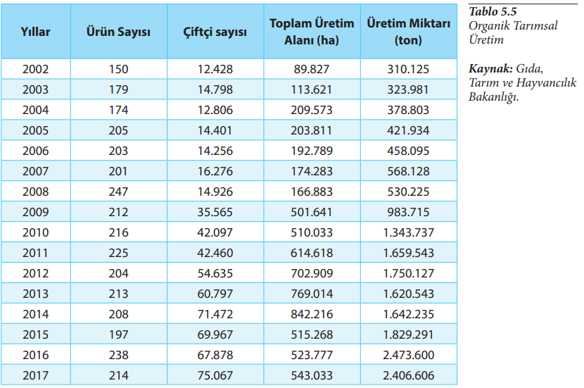 Türkiye’de yapılan çalışmalarla 2002 yılında 90 bin hektar alanda, 310 bin ton, 150 çeşit organik ürün, 2010 yılında 510 bin hektar alanda, 1,34 milyon ton, 216 çeşit organik ürün üretilirken, 2017 yılında ise 544 bin hektar alanda, 2,40 milyon ton, 214 çeşit organik bitkisel ürün üretilmiştir.
