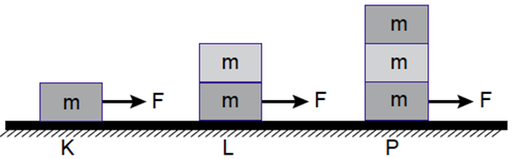 Şekilde verilen K,L,P sistemlerinde m kütleli özdeş kutular F kuvvetiyle hakret ettiriliyor. Bu cisimlere etki eden sürtünme kuvvetlerini FK, FL, FP arasındaki büyüklük ilişkisi nedir?