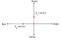 Şekilde görüldüğü gibi bir K arabası kuzey yönünde 30 m/s ’lik bir hızla ilerlerken, bir L arabası doğu yönünde 40 m/s ’lik bir hızla hareket etmektedir. K arabasını süren şoför L arabasını hangi yönde ve hangi hızla gidiyor gibi görür?