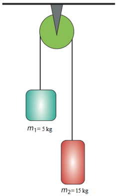 m 1 = 5 kg ve m 2 = 15 kg kütleli iki cisim yukarıda görüldüğü gibi kütlesi ihmal edilebilir bir makara üzerinden dolanan ağırlıksız bir ipin iki ucuna asılmıştır. Her iki kütlenin ivmesi kaç m/s2 olur? (Hava sürtünmesini ihmal ediniz, yerçekimi ivmesinin büyüklüğünü g=10 m/s 2 alınız.)