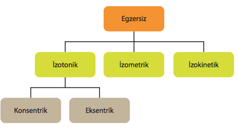 Kasın kasılma tipine bağlı olarak egzersiz sınıflandırmasına dair verilen şemada "Konsentrik" egzersiz türü hangi numarayla gösterilmiştir?