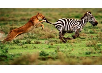 Bir aslan bir zebrayı kovalamaktadır |