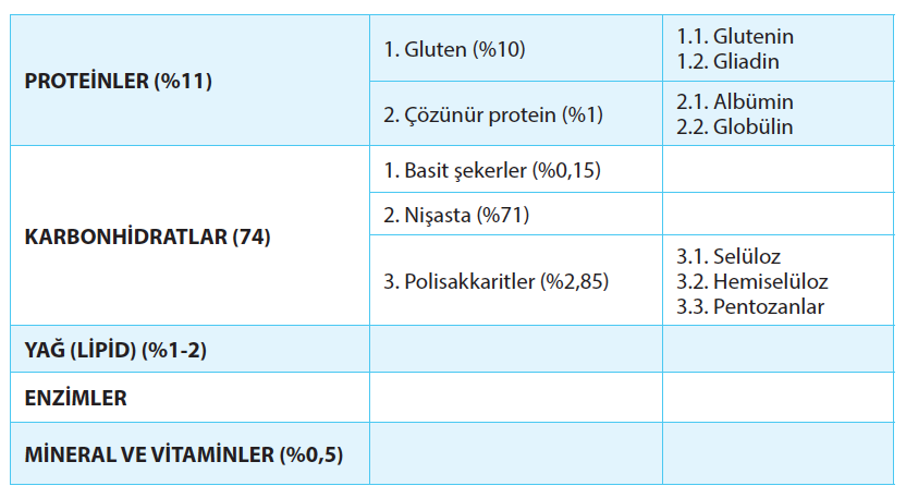 Protein (%11) – Karbonhidrat (% 75) – Yağ (% 1-2) – Mineral ve vitamin (% 1) |