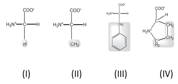 Glisin en basit yapılı aminoasittir, R grubunda sadece H vardır, asimetrik karbon atomu içermez. Valin, lösin, izolösin dallı yan zincirli aminoasitlerdir. Alaninin R grubunda metil grubu bulunur. Fenilalaninde metil grubuna fenil grubu bağlanmıştır. Metiyoninin yapısında metil ve kükürt bulunur. Triptofan indol halkası içeren bir aminoasittir.