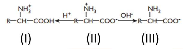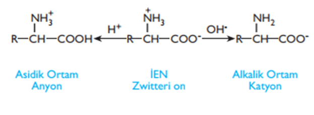 Asidik ortam (Katyon) – İzoelektrik Nokta (Zwitterion)- Alkali Ortam (Anyon) |