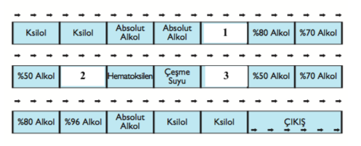 Yukarıdaki resimde otomatik hematoksilen-eozin boyama aletine ait işlem sıralaması gösterilmiştir. 1, 2 ve 3. kısımdaki işlem basamakları ile ilgili olarak aşağıdaki eşleşmelerden hangisi doğrudur?