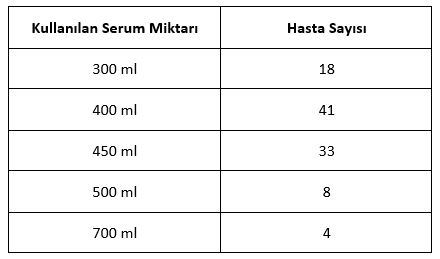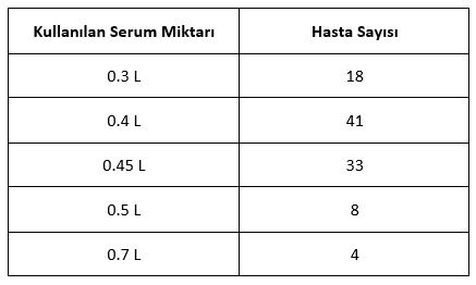 Yukarıdaki tabloda bir hastanede bir gün içerisinde kullanılan serum miktarları yer almaktadır. Buna göre kullanılan serum miktarının ortalaması nedir?