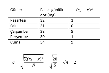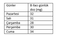 5 iş gününde bir hastanın onkoloji destek tedavide aldığı B ilacının dozu verilmiştir. Buna göre standart sapma nedir?