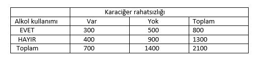 Bir hastaneye başvuran 2100 hastanın alkol kullanımı ve karaciğer rahatsızlığı geçirip geçirmediği ile ilgili elde edilen bilgiler aşağıdaki tabloda verilmiştir. Buna göre Göreli Risk Oranı nedir?
