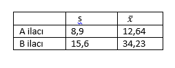 Onkoloji destek tedavi biriminde A ve B ilaçlarının tüketimi ile ilgili ortalama ve standart sapma değerleri aşağıda verilmiştir.