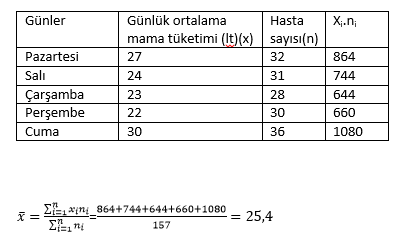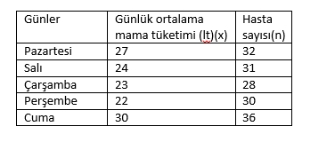 Kemoterapi tedaviye gelen hastalara verilen mamanın tüketimi(lt) ve hasta sayısı aşağıda verilmiştir. Buna göre serviste günlük ortalama kaç litre mama tüketilmektedir?