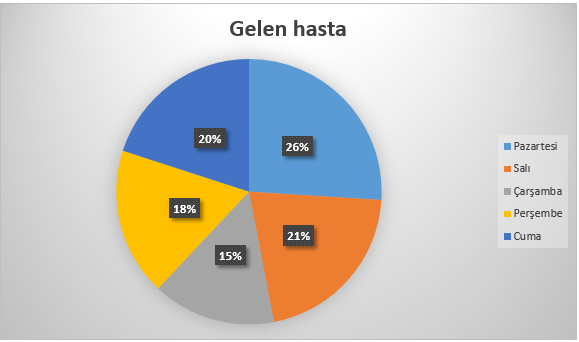 Bir aile sağlığı merkezinde haftanın günlerine göre geliş yoğunluğu yukarıda verilen daire (pasta) grafiğinde gösterilmiştir. Buna göre gelişin en yoğun olduğu 2. gün hangisidir?