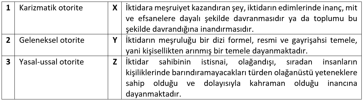 Yukarıdaki tabloda verilen Max Weber'in ileri sürmüş olduğu üç otorite biçimi ve tanımlarının doğru eşleştirmesi aşağıdakilerden hangisidir?