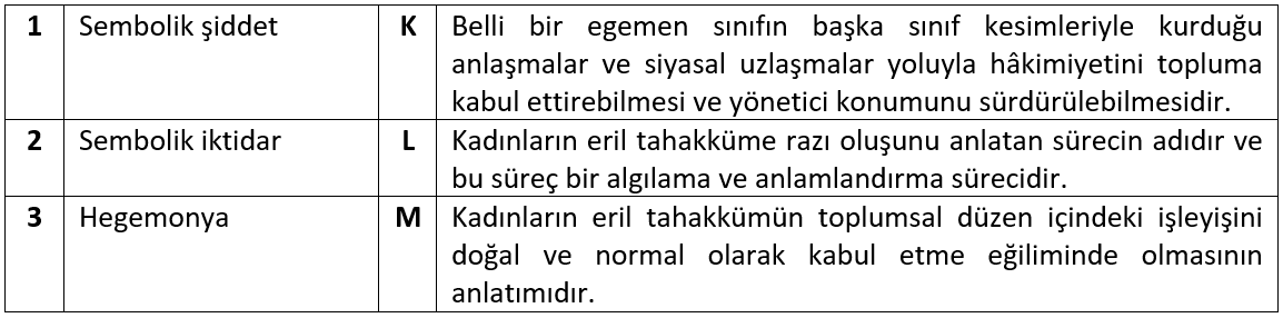 Doğru eşleştirme 1-M, 2-L, 3-K şeklindedir. Dolayısıyla doğru cevap C seçeneğidir.