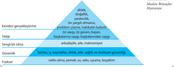 Yukarıda Maslow'un ihtiyaçlar hiyerarşisinin piramidal gösterimi verilmiştir. Bu gösterime göre en alt basamakta Fiziksel yer almaktadır. Dolayısıyla Doğru Cevap E seçeneği olur.