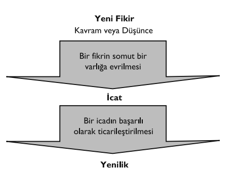 Yenilik, mevcut mal ve hizmetlerden ölçülebilir derecede farklılaşmış, tüketiciler tarafından yeni olarak algılanan mal ve hizmetleri ifade eder. Bir diğer ifadeyle yenilik, yeni olan fikirlerin ve icatların ticarileştirilerek toplumsal ve ekonomik faydaya dönüştürülmesi olarak tanımlanmaktadır. İcat, yeni bir ürün fikrinin ya da üretim veya yönetim süreciyle ilgili bir fikrin ilk defa ortaya konulmasıdır. Başka bir ifadeyle icat, daha önce keşfedilmemiş ya da bulunmamış bir şeyi bulup çıkarmak olarak ifade edilir. İcadın teknik yönü genellikle ön plandadır ve ticari özelliği bulunmamaktadır. Çeşitli gerekçelerle yeniliğe dönüşememiş birçok icat veya yenilik fikri bulunabilir. Doğru cevap B’dir.