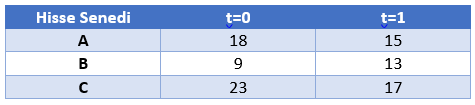 Yukarıdaki tabloda A, B ve C şirketlerinin pay senetlerinin t=0 ve t=1 zamandaki değerleri gösterilmiştir. Buna göre bu pay senetlerinin t=1 zamandaki fiyat ağırlıklı pay senedi endeksi kaçtır?