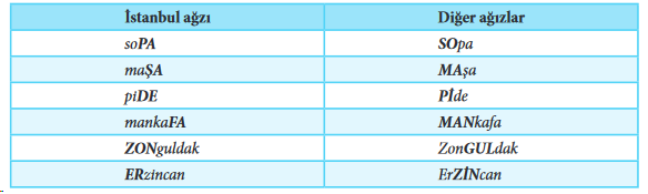 Standart vurgulamadan sapmalar konusunda Doğan Aksan, aşağıdaki örneklerde, standart (İstanbul) ağzı ile öteki ağızlar arasındaki vurgu farkına işaret etmiştir